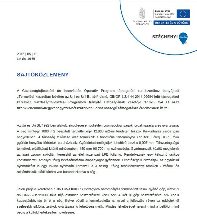 • a projekt címe: Új eszközök beszerzése az Uri és Uri Bt-nél